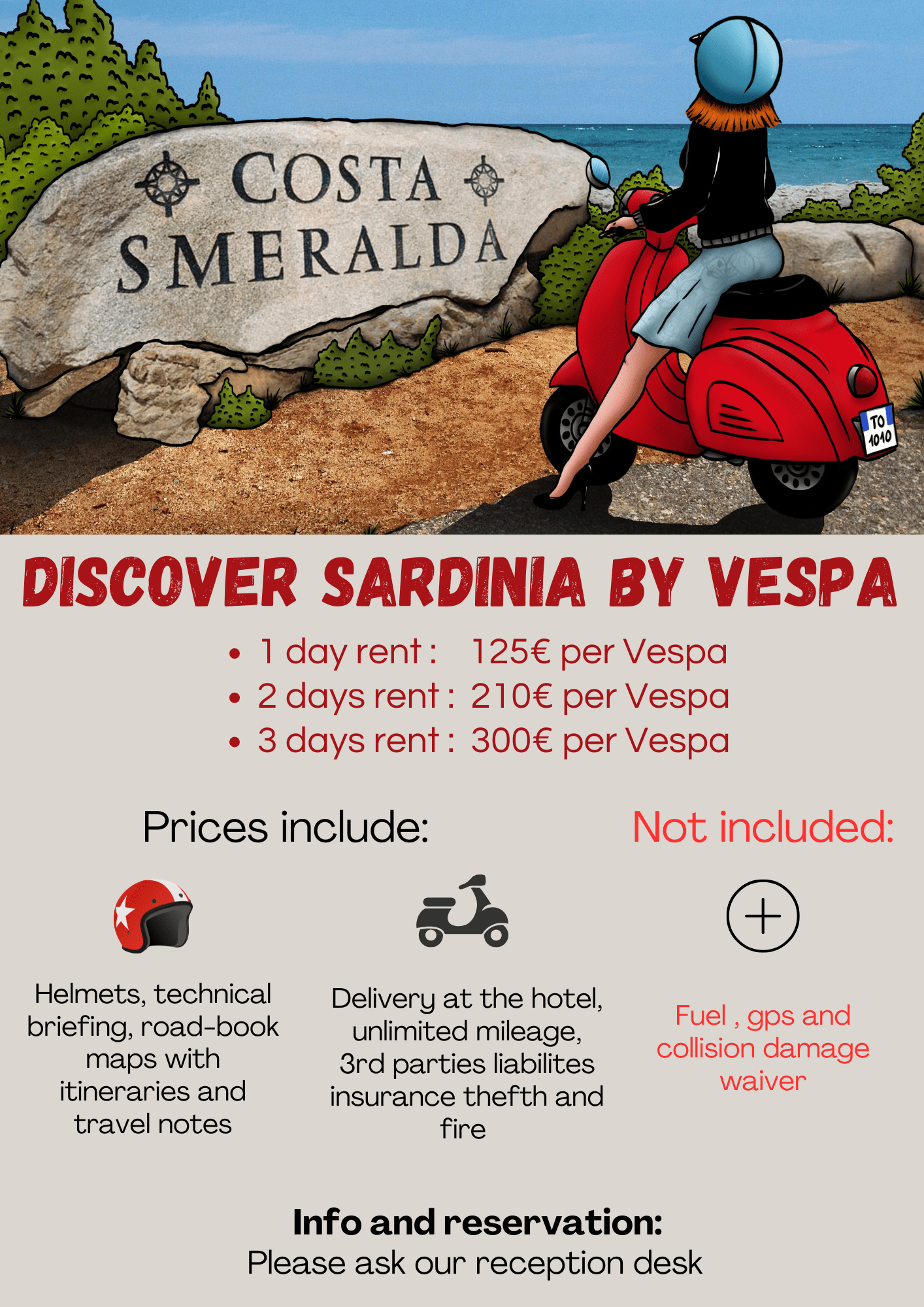 Scopri la Gallura in sella a una Vespa e vivi la Sardegna al tuo ritmo. Attraversa strade panoramiche tra spiagge dorate, colline verdi e borghi ricchi di storia. Ti consegneremo la Vespa direttamente in hotel, completa di caschi, mappe e itinerari per esplorare ogni angolo di questo territorio unico. Lasciati guidare dal paesaggio e dalla libertà della strada. Prenota ora e vivi l’essenza della Sardegna con il vento tra i capelli.